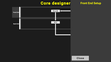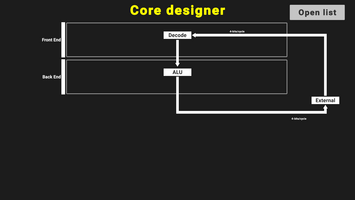 Now you are looking at the Core designer panel. Clicking Open list lets you open up the previous panel in the forground. The architecture you are looking at is extremely basic, as it was (and will be in the game) in the 1970's and early 1980's, where the performance uplift came from higher bits, better ISA optimizations, better buses and higher clocks, and not from pipelined and superscalar CPU cores, like it did later. This is a simple fetch-decode-execute machine. You will be able to design way more complex cores as the game progresses. Clicking on the Front End for example (these bars act as buttons too) will open up a panel with tons of different design decisions, where you will be able to add an instruction cache for example, or make a decoding stage, add a branch predictor and so on...