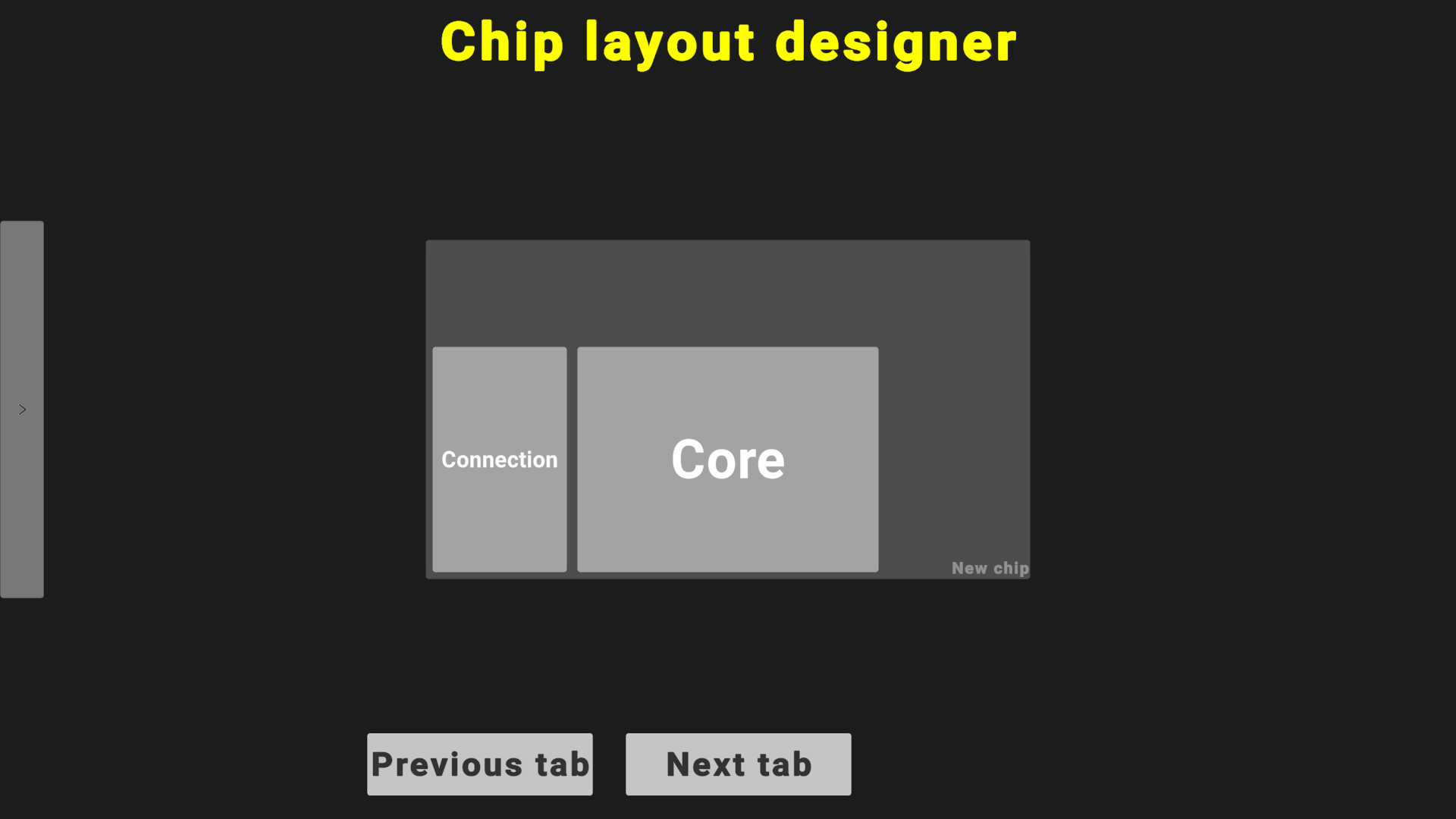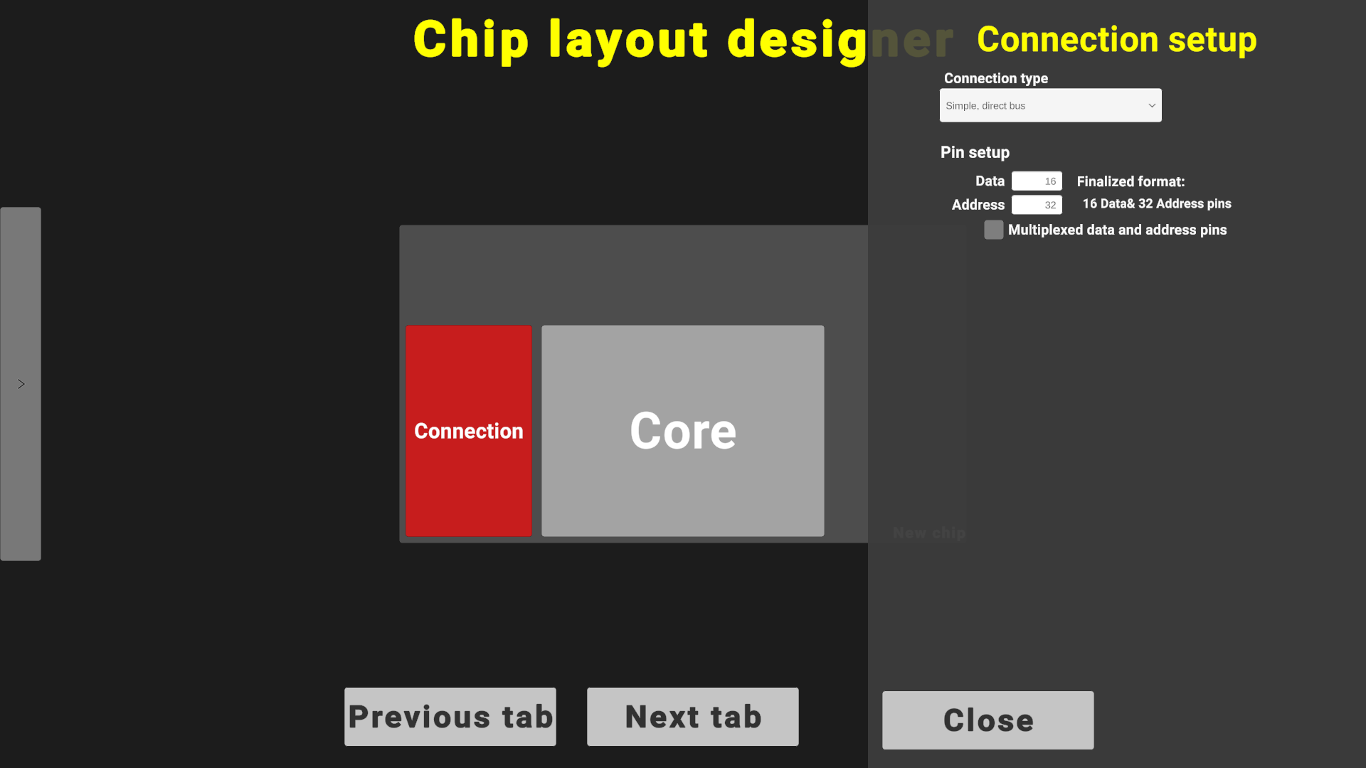 Now we look at the Chip layout designer, where you design the chips layout. It is very early in development, it lacks most features, but it already has what we will look at now. As we have talked about address space, the amount of pins a CPU has are related to it.