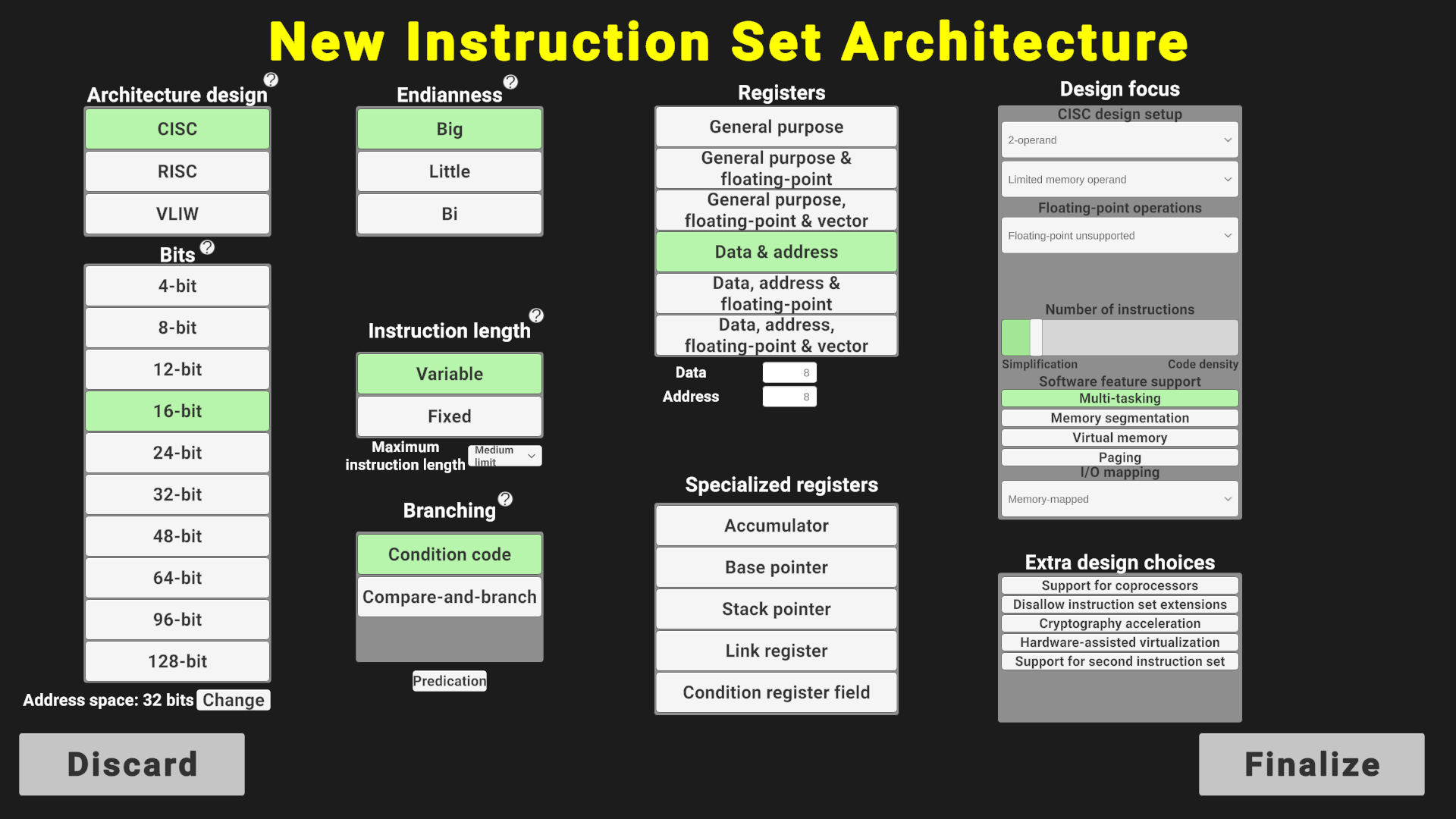 As the title said, address space has been added to the game. When designing ISAs, you will have to decide how big do you want it to be.